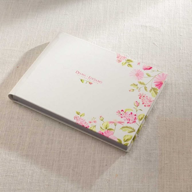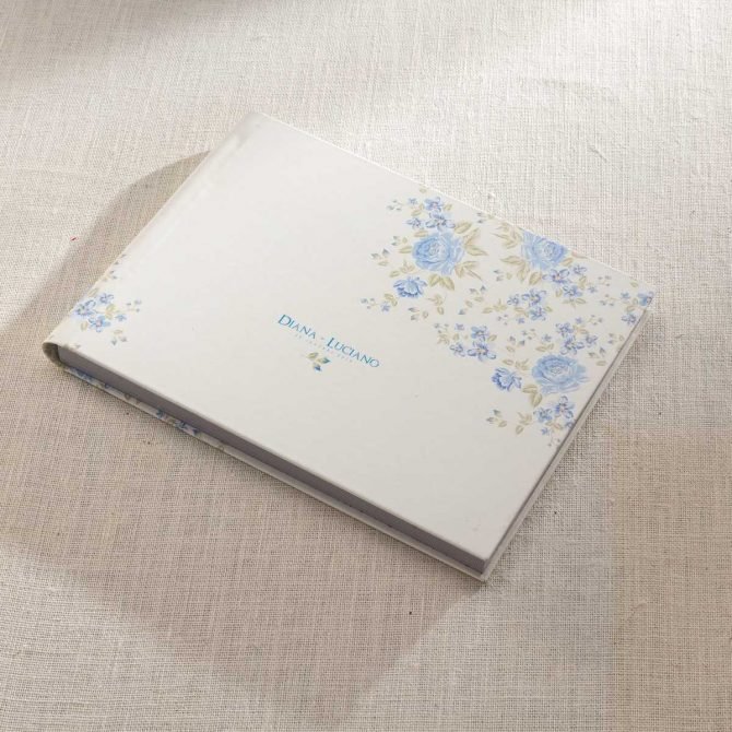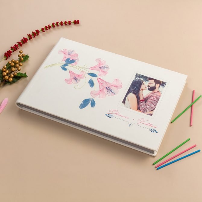 - Customised box with leather cover of same colour with name embossed on album cover with a beautiful floral arrangement embossed below the name
