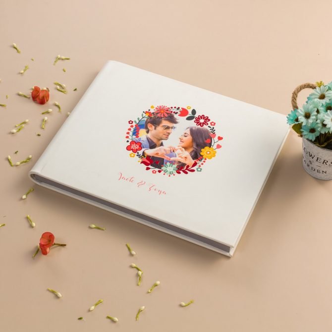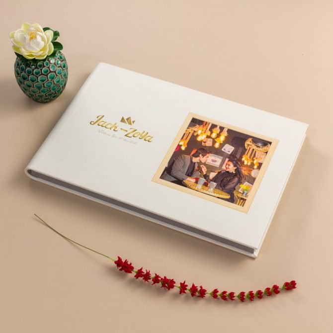 - A beautifully created textured leather cover album with a premium designed customised box. Couple name embossed below the photo window on the album cover
